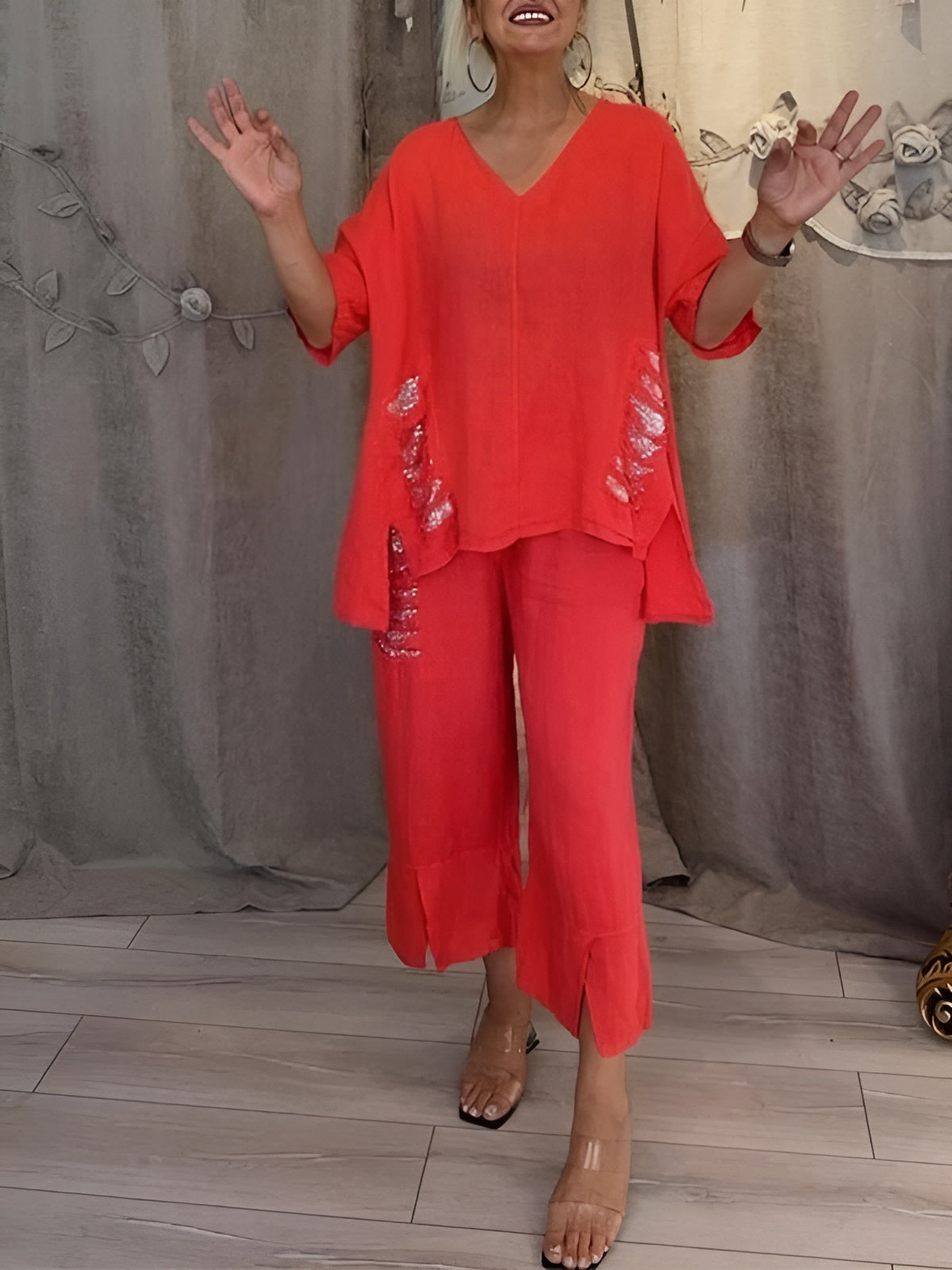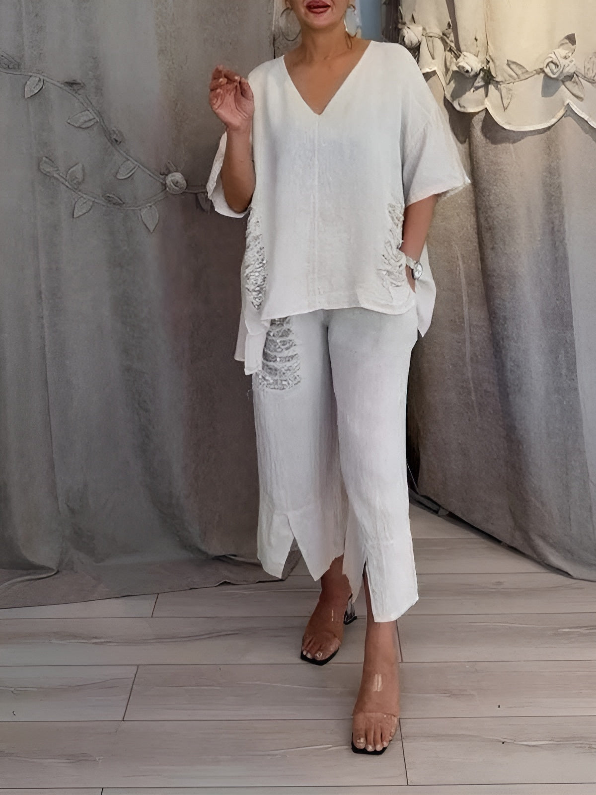 Ressens cette légèreté, liberté et confiance en portant cet ensemble deux pièces qui allie parfaitement style et confort. Édith™ | Ensemble d'été Deux Pièces est fait pour les journées ensoleillées où tu veux briller sans effort – que ce soit en terrasse, en promenade sur la plage ou simplement dehors.