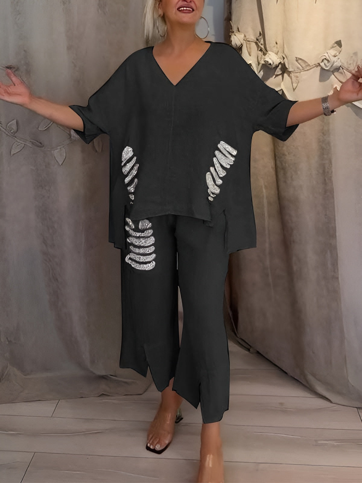 Coupe flatteuse – Le haut fluide et le pantalon à jambes larges offrent une allure élégante tout en restant confortable.